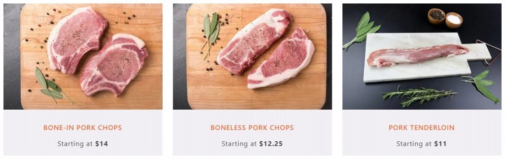 You can shop cuts of both 100% grass-fed, pasture-raised beef, as well as slightly more affordable pastured grain-finished beef. For comparison, a 12 oz. grain-finished New York Strip Steak costs $21, while the same cut from a grass-fed cow is $21.75. The leaner grass-fed beef usually takes less time to cook and is higher in heart-healthy omega-3s. Available cuts include everything from basic ground beef to bone-in ribeye and bacon-wrapped sirloins.